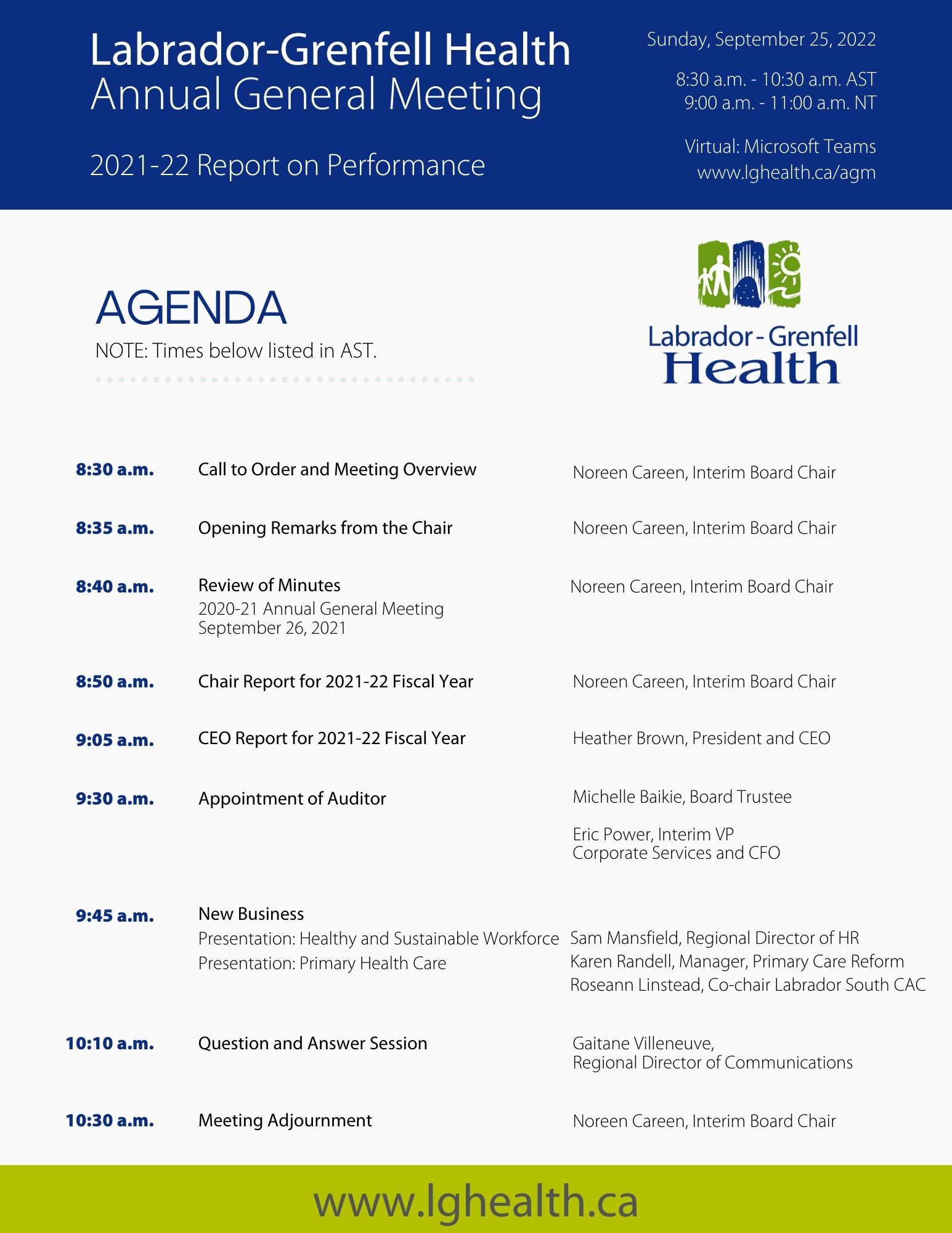 Labrador-Grenfell Health is holding its 2021-22 Annual General Meeting on Sunday, September 25, 2022 at 8:30 a.m. AST/9:00 a.m. NT Scheduled to be hosted in L’Anse-au-Loup, the meeting will now be VIRTUAL ONLY due to forecasted weather conditions from Hurricane Fiona.