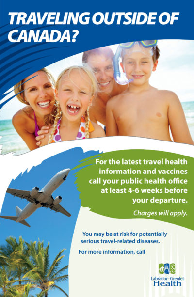 Labrador-Grenfell Health offers immunization and travel health information/advice for residents of the region who travel outside of Canada. Individuals who travel to vacation destinations may be at risk for a number of vaccine preventable illnesses. For the latest travel health information and immunization recommendations, contact the nearest Public Health Office at least 4-6 weeks before your departure.